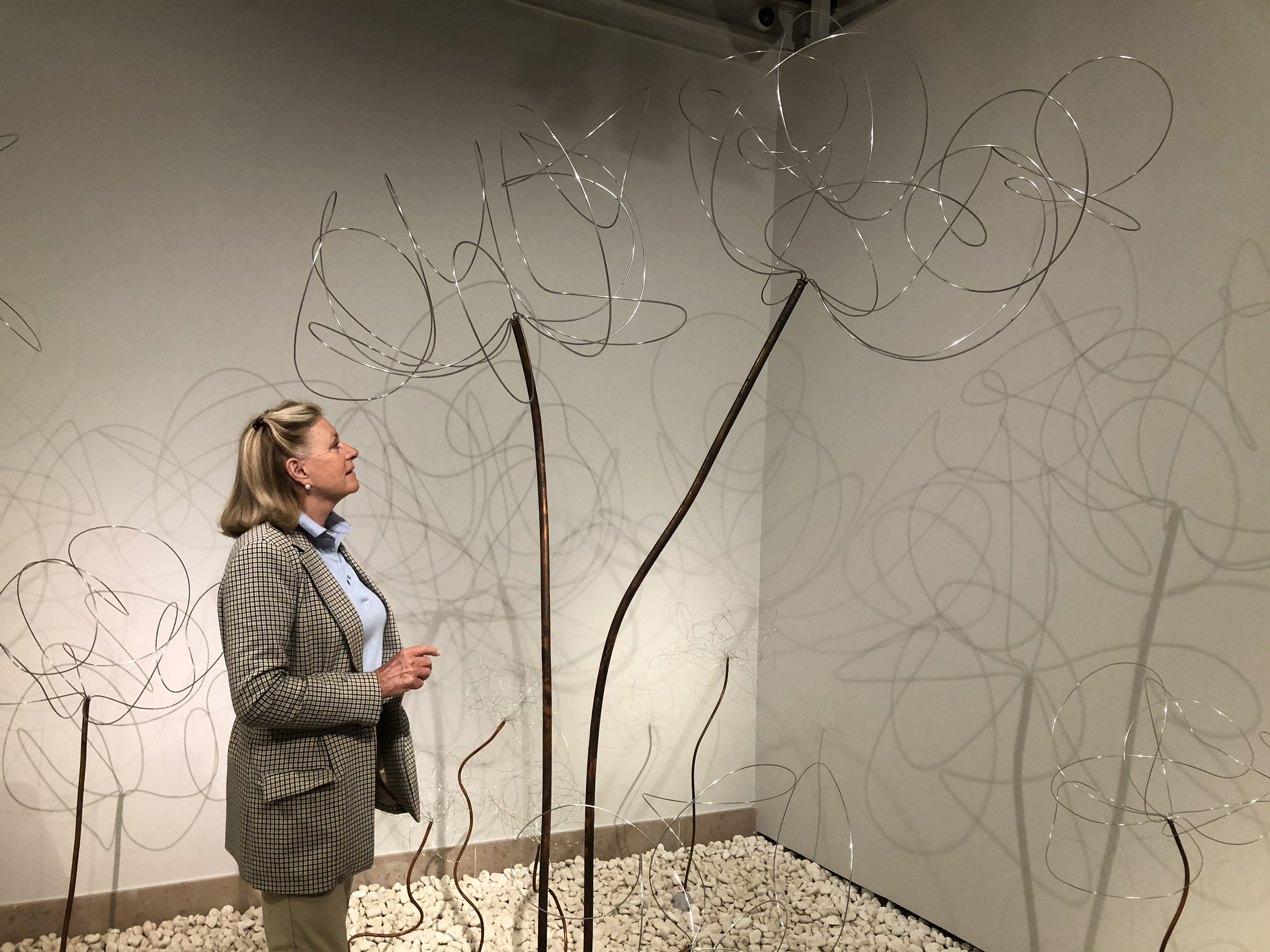 Pour créer « Photosynthesis », elle sculpte le vide et utilise des fils d’acier inoxydable pour l’appréhender. Certains pourront y voir des végétaux, métalliques, tel un bug dans la théorie de l’Evolution de Darwin, d’autres une conception cosmologique fondée sur l’idée du souffle du vide médian, à la fois matière et esprit.